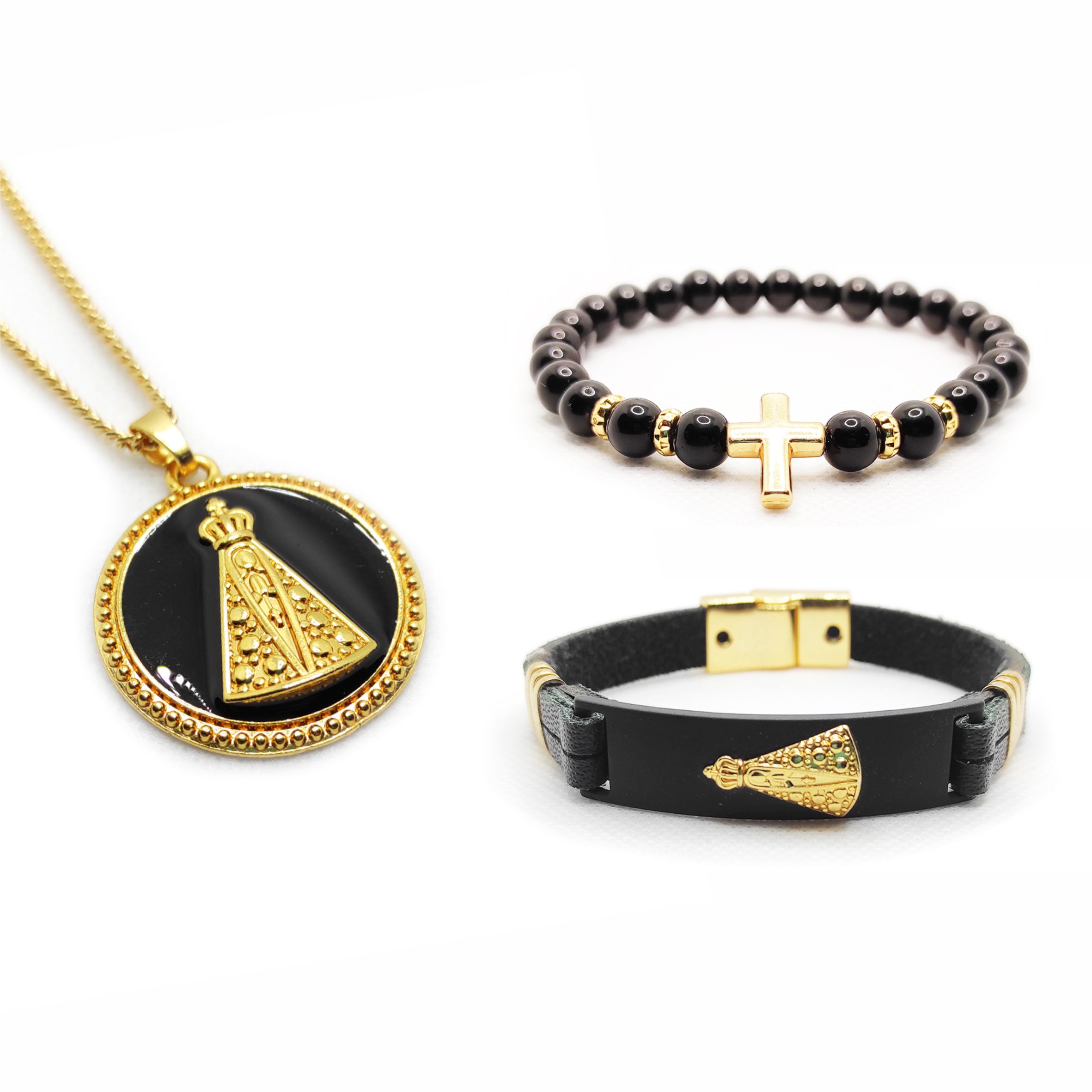 Domina Nostra Gold é um combo formado por 2 pulseiras e 1 colar da nossa coleção: Nossa Sra. Black, Rolld Gold e Nossa Sra. Gold, sendo 1 pulseira de couro, 1 pulseira de pedra natural e 1 colar de corrente, as pulseiras estão disponíveis em 5 tamanhos que vão do PP = 16cm ao GG = 20cm e o colar é tamanho único com 70cm em média.
