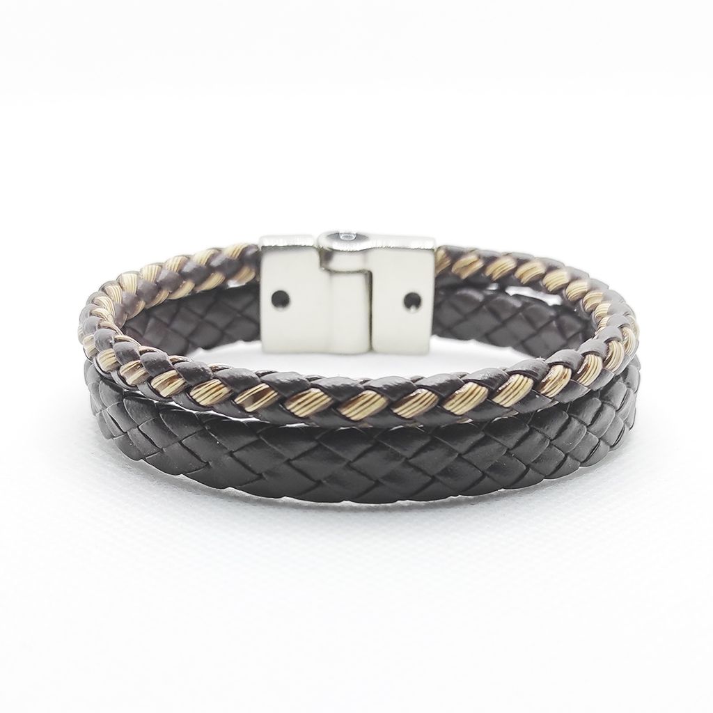 A Hibryan Brown é uma pulseira que une texturas e cores de forma harmônica. Produzida com uma tira de couro sintético trançado de 10 mm e uma tira de couro roliço trançado em marrom com fios dourados, ela recebe acabamentos metálicos em aço com banho duplo de verniz italiano no tom níquel. Seu design combina robustez e sofisticação, resultando em um acessório versátil e marcante.