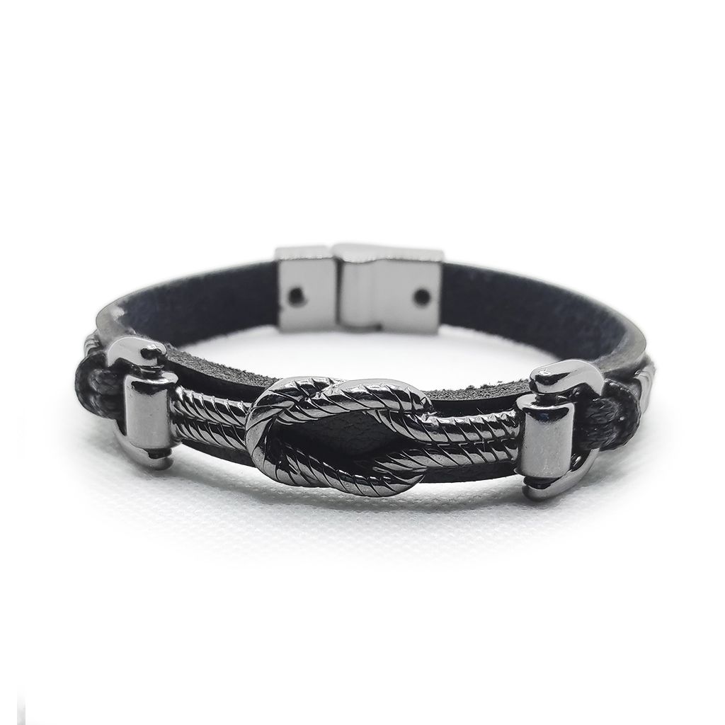 Inspirada no universo náutico e na simbologia de resistência e união, a Kruang foi desenvolvida para homens que valorizam acessórios com identidade forte e design impactante. O contraste entre o preto do couro e o grafite dos metais reforça sua presença e versatilidade.