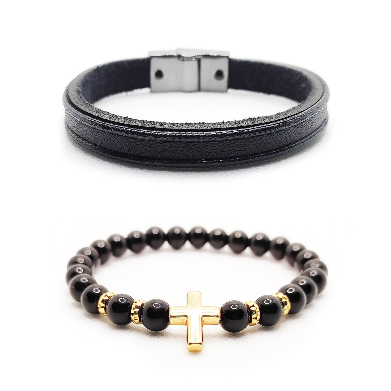 Legendary é um combo novo em nossa coleção, ele é composto de duas pulseiras sendo uma de couro natural e couro semi-sintetico e uma pulseira de pedras naturais do tipo ONIX, o combo está disponivel em 5 tamanhos, confira o guia de medidas.