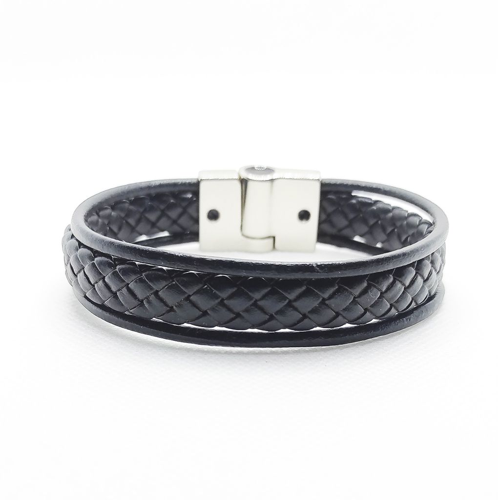 A Mont Black é uma pulseira que transmite força e estilo em um design minimalista e marcante. Produzida com uma tira de couro trançado de 10 mm, complementada por duas tiras de couro natural roliço de 3 mm, ela é finalizada com metais em aço com banho duplo de verniz italiano no tom níquel. A combinação das texturas cria um visual moderno e versátil, ideal para diferentes ocasiões.