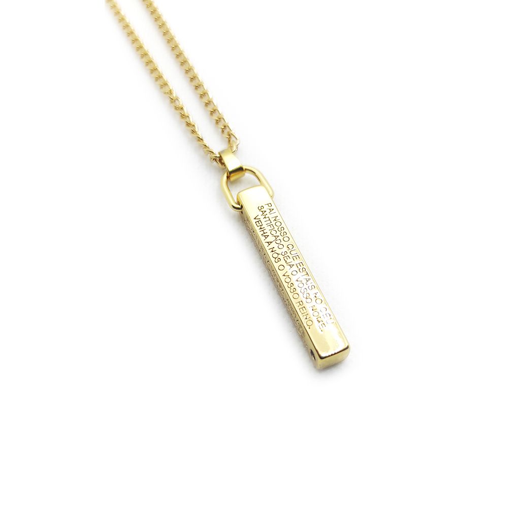 Inspirado na oração mais tradicional do cristianismo, o Pai Nosso Gold traz a oração gravada em baixo-relevo nas quatro faces do pingente, como um lembrete constante de fé e conexão espiritual. Seu acabamento dourado agrega sofisticação e profundidade simbólica à peça, tornando-se um colar com forte carga emocional e visual.