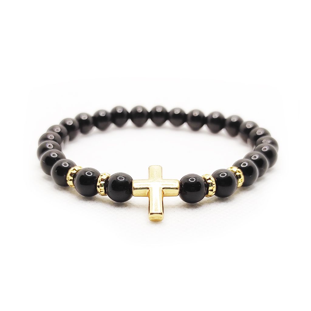 A Rolld Gold é uma pulseira feita com pedras naturais de ágata preta de 8 mm, conhecidas pelo seu tom profundo e elegante. Montada em elástico ultra resistente, possui entremeios e cruz central em dourado, criando um contraste refinado e marcante.