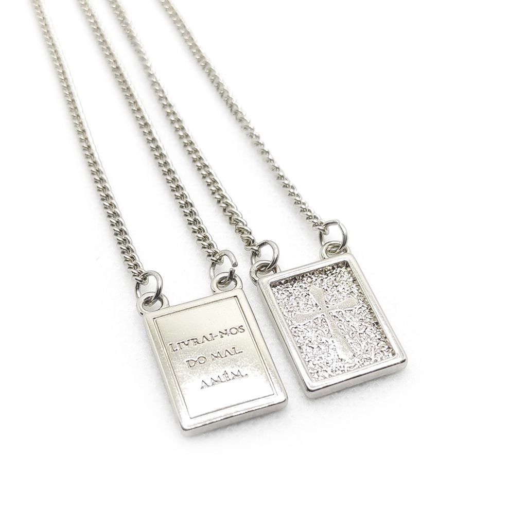 Com dois pingentes — um voltado para o peito e o outro para as costas — o escapulário respeita o formato tradicional, agora com acabamento prateado para quem busca uma estética moderna, discreta e elegante, sem abrir mão do significado.