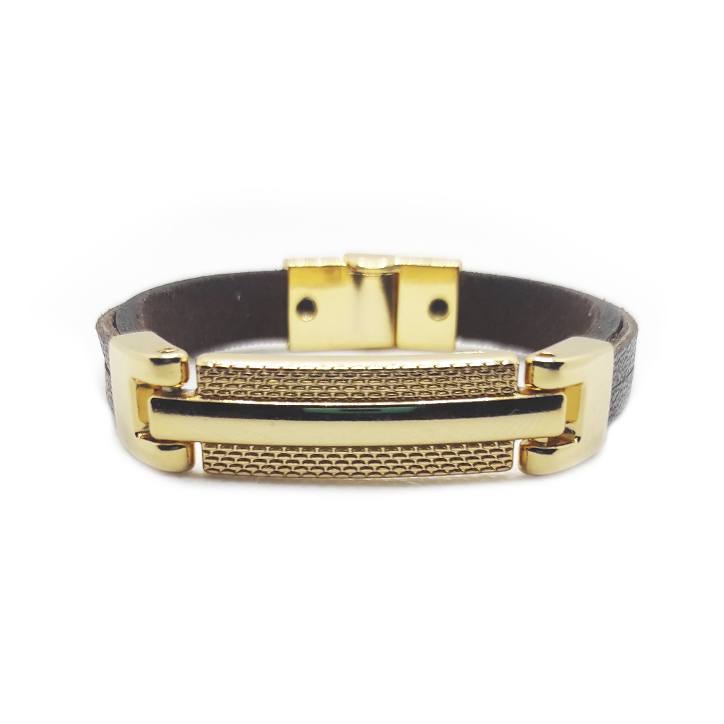 A Social Gold é uma pulseira que une elegância e modernidade em um design sofisticado. Produzida com couro padrão de 10 mm e laterais em couro natural, apresenta um visual imponente e versátil. Os metais, em aço com banho duplo de verniz italiano na cor dourada, oferecem brilho duradouro e resistência, enquanto o trabalho texturizado na parte central traz profundidade e exclusividade ao design.