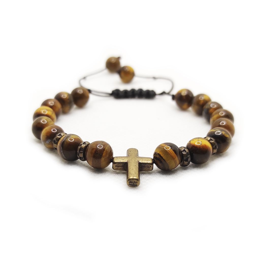 A Thunder é feita com pedras naturais Olho de Tigre de 8 mm, entremeios e cruz em ouro velho. Diferente das demais, seu design conta com ajuste em fio de algodão encerado de 1 mm, oferecendo tamanho único e adaptação perfeita ao pulso, unindo praticidade e personalidade.