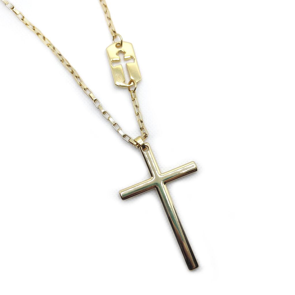 Pingente secundário: mini placa com recorte de cruz fixado à corrente.